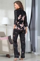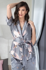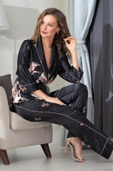 Элегантный комплект-тройка Mia-Amore из искусственного принтованного шелка, состоит из жакета, топа и брюк. Жакет свободного силуэта, с отложным воротником, с рукавами ¾. Линию борта и манжеты рукавов украшают тонкие контрастные канты. К жакету прилагается пояс. Топ на тонких бретелях из однотонного искусственного шелка. Брюки выполнены из искусственного принтованного шелка, боковые швы и манжеты декорированы контрастным кантом, в боковых швах карманы. Состав 100% полиэстер
