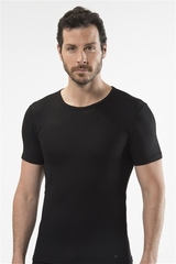 Мужская термо футболка с коротким рукавом и круглым вырезом горловины. Облегающая. Бесшовная. Длина изделия 70 см (для размера М). Состав: 49% вискоза; 49% полиэстер; 2% эластан