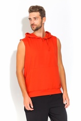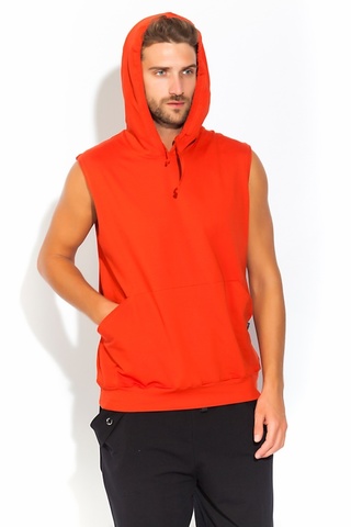Футболка в модной тенденции этого сезона: без рукавов, с полноценным капюшоном на завязках и внешними карманами на передней части в стиле "кенгуру". Она выполнена из хлопковой ткани средней плотности с добавлением лайкры(лайкра позволяет лучше держать форму изделия и не деформироваться, предотвращает выстирование цвета).