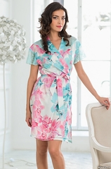 Халат Mia Sofia выполнен из эффектного принтованного искусственного шелка с короткими рукавами из кружева в тон ткани. Состав: 100% полиэстер