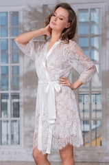 Халат Mia-Amore выполнен из тончайшего французского кружева Шантильи (Chantilly) с изысканным рисунком по низу халата и рукавам. По переду халата планка из шелкового атласа. Пояс халата выполнен из атласа. Состав: 100% полиэстер