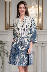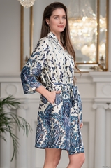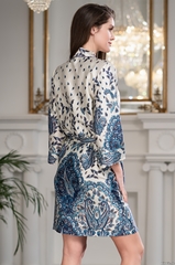 Короткий халат с запахом и на поясе Mia-Amore выполнен из принтованного смесового шелкового полотна. В боковых швах халата есть карманы. Состав 75% натуральный шелк, 25% полиэстер, 5% эластан