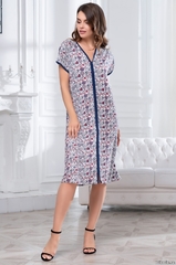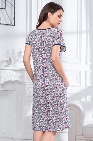Халат Mia-Mella длиной до колена с короткими рукавами с удобной застежкой на молнию выполнен из трикотажного принтованного мелкоузорчатым цветным принтом полотна. Рукава, борт и карманы халата окантованы синим трикотажем.