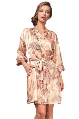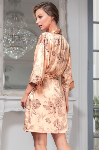 Короткий халат – кимоно Mia-Amore из смесового шелкового полотна молочного цвета с цветочным орнаментом. Борта халата, притачные широкие манжеты на рукавах ¾ и широкий пояс халата, декорированы тонким кантом цвета графит, в тон принта.