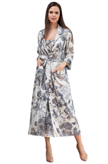 Элегантный длинный халат на пуговицах Mia-Amore выполнен из смесового шелкового полотна молочного цвета с цветочным орнаментом. Отложной воротник, линия бортов, притачные широкие манжеты рукавов и накладные карманы халата декорированы отделкой в виде канта цвета графит, в тон принта. В комплекте к халату идет пояс. Состав: 70% натуральный шелк, 25% полиэстер, 5% эластан