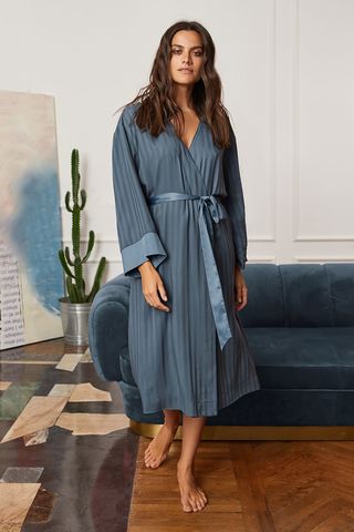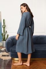 Домашний и уютный халат из поливискозной ткани. Выполнен в благородном синем цвете. Халат с поясом не стесняет движений и идеально подходит для полноценного отдыха дома. Модель длиной ниже колена, свободного и удобного кроя с широкими рукавами. район 100%