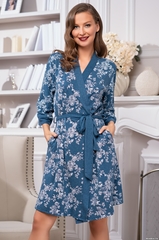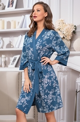 Классический запашной халат Mia-Mella с рукавом 3/4 , выполнен из принтованного трикотажного полотна с отделкой из однотонного трикотажа по бортам и манжетам рукавов. По бокам обработаны карманы. Состав 95% вискоза, 5% эластан