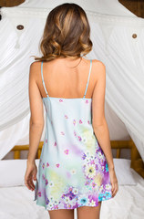 Сорочка Миа-Миа полуприлегающего силуэта из шелка-сатина с нежным принтом. Сорочка с подрезом под грудью, чашки лифа со сборкой для придания объема. Разрез по боку с левой стороны. Маленькие аккуратные бантики белого цвета из атласной ленты декор по груди. Нежный принт придает данной коллекции весеннее настроение. Состав: 100% полиэстер