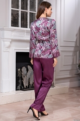 Комплект Mia-Amore состоит из жакета и брюк. Жакет с длинным рукавом и поясом, выполнен из принтованного искусственного шелка с отделкой из ткани компаньона и контрастного канта по краю борта и низу рукавов. По бокам расположены накладные карманы. Брюки выполнены из однотонного искусственного шелка. По бокам обработаны карманы, по низу расположены небольшие разрезы. Состав: полиэстер 100%