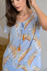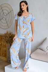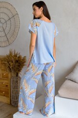 Комплект состоит из топа c коротким рукавом и широких брюк. Комплект выполнен из двух видов тканой вискозы: принтованной и однотонной. По бокам брюк расположены карманы.