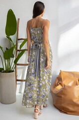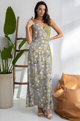 Длинный запашной сарафан на тонких бретелях. Изделие выполнено из двух видов тканой вискозы с шелком, принтованной и однотонной. Ширину изделия можно регулировать за счет пояса, части которого пришиты по краям бортов.