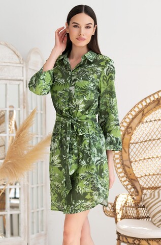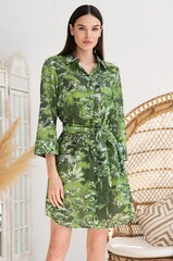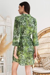 Рубашка свободного силуэта с рукавом длиной ¾. В боковых швах обработаны карманы. По низу изделия расположены разрезы. Линию талии можно подчеркнуть за счет пояса, который идет в комплекте.