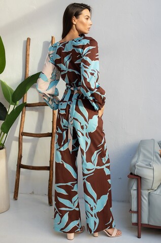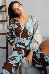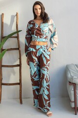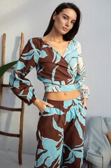 Комплект состоит из запашного кроп-топа с длинным рукавом и широких брюк. Изделие выполнено из двух видов принтованного хлопка. По бокам брюк обработаны карманы.