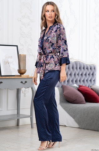 Комплект Mia-Amore из принтованного смесового полотна. Комплект состоит из блузы на пуговицах и брюк из однотонной ткани с содержанием эластана. Блуза с отложным английским воротничком и кармашками. Борт блузы отделан атласным кантом голубого цвета. Кармашки и низ рукавов декорированы вышивным французским кружевом.