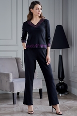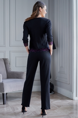 Элегантный брючный комплект Mia-Amore выполнен из фактурного трикотажного полотна в рубчик. Футболка с рукавами ¾ украшена двухцветным эластичным кружевом по низу, вдоль V-образной горловины и по низу рукавов. На горловине футболки изысканный бантик с подвеской. Длинные брюки с широкой резинкой по талии и боковыми карманами. Состав 100% вискоза