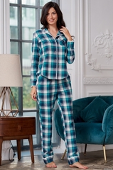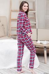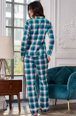 Комплект Mia-Mella состоит из рубашки с длинным рукавом и брюки, выполнен из хлопковой фланелевой ткани в клетку. Рубашка с застежкой на кнопки. На левой части рубашки расположен накладной карман с вышивкой. По бокам брюк обработаны карманы. Комплект украшен узким кружевом. Состав 100% хлопок