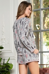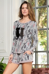 Комплект Mia-Mella состоит из лонгслива и шорт. Комплект выполнен из принтованного мягкого серого меланжа. Спереди на лонгсливе эффектная блестящая аппликация в виде кошек, выполненная в технике би-колор. Состав 35% акрил, 35% полиэстер, 25% вискоза, 5% спандекс