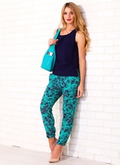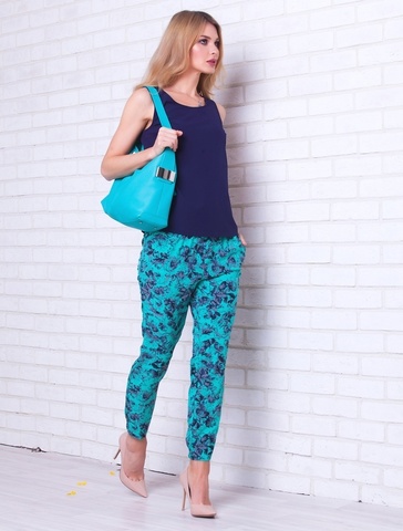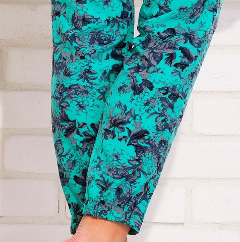 Оригинальный легкий комплект от Французской Торговой марки PECHE MONNAIE из натуральной слегка эластичной вискозы - хит 2016 года! В комплект входит топ и брюки. Брюки: Универсальная длина 7/8, брюки зауживаются к низу, удобная и комфортная посадка. Рост модели на фото 172 см., размер XS(Российский 44). Мягкий и широкий пояс на резинке. В нижней части брюк с задней стороны - внутренняя резинка(Фото 5), для оптимальной посадки и удобства в движении. Удобные внутренние карманы. Красивый принт в виде крупных цветов на бирюзовом фоне.