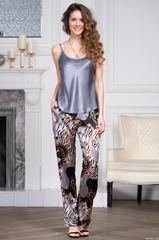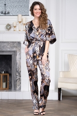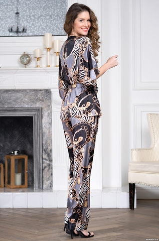 Комплект- тройка Mia-Amore состоит из запашного жакета, брюк и топа. Жакет и брюки выполнены из принтованного атласа с отделкой в виде золотых кантов, а топ выполнен полностью из однотонного атласа. Низ рукавов и низ брюк обработаны манжетами с небольшими разрезами. В боковых швах брюк расположены карманы. В комплекте к жакету прилагается пояс, концы которого украшают золотые кисточки. Состав: полиэстер 100%