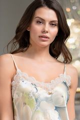 Короткая сорочка Mia-Amore с вытачками на груди на тонких бретелях выполнена из принтованного смесового шелкового полотна. Лиф сорочки декорирован вышивным кружевом и бантиком по центру лифа.