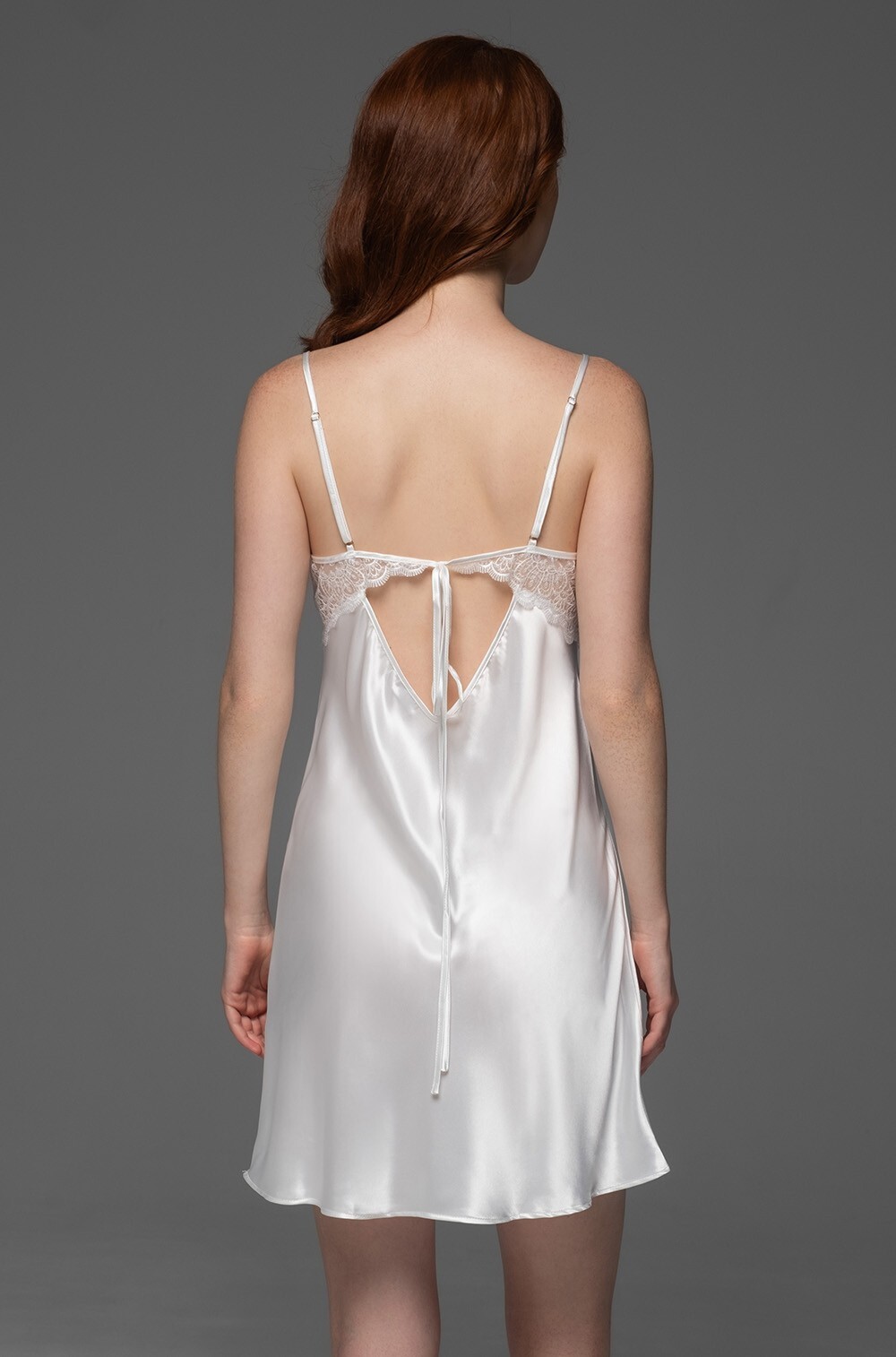 Короткая сорочка Mia-Amore на тонких регулируемых бретелях выполнена из однотонного смесового шёлка. Лиф сорочки декорирован вышивным мягким кружевом, на спинке эффектный вырез с кружевом и завязкой.