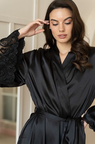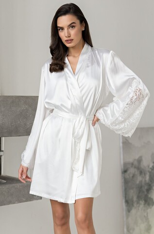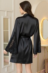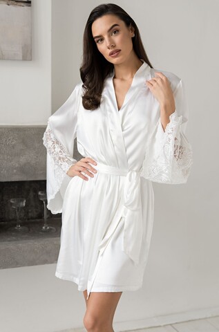 Короткий запашной халат Mia-Amore с длинными широкими рукавами выполнен из принтованного смесового шёлка. Рукава декорированы вставкой из вышивного кружева, по низу рукав отделан узким кружевом. Халат комплектуется широким поясом, в боковых швах карманы.