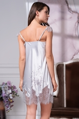 Короткая сорочка с отрезными чашками Mia-Amore на тонких бретелях выполнена из принтованного серебристого смесового полотна. Низ сорочки и бретели декорированы изысканным широким вырезным кружевом. По центру лифа бантик с подвеской.