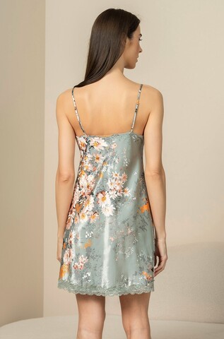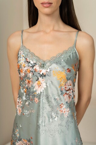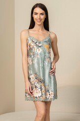 Короткая сорочка Mia-Amore без подреза на тонких бретелях выполнена из принтованной смесовой ткани. Лиф сорочки и низ декорированы кружевом.