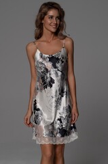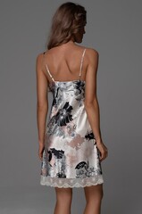 Короткая сорочка Mia-Amore на тонких бретелях, без подреза под грудью. Изделие выполнено из принтованного смесового шелка. Низ изделия декорирован изящным кружевом.