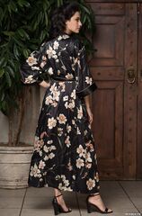 Длинный халат – кимоно Mia-Amore из смесового шелкового полотна с элегантным цветочным принтом. Борт халата, притачные широкие манжеты на рукавах, отделка накладных карманов и пояс халата выполнены из черного смесового шелка с кантом золотистого оттенка в цвет принта.