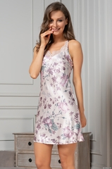 Короткая сорочка Mia-Amore на тонких бретелях без подреза под грудью, выполнена из принтованного смесового шелка. Вырез украшен ажурным кружевом. Декор - атласный бантик с подвеской по центру выреза.