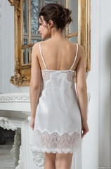 Короткая сорочка Mia-Amore на тонких бретелях без подреза под грудью, выполнена из искусственного шелка с жаккардовой основой. Вставки из ажурного кружева украшают низ сорочки, а также верх спинки. Вырез обработан узким кружевом. Декор - атласный цветок по центру выреза. Состав 100% полиэстер