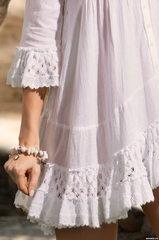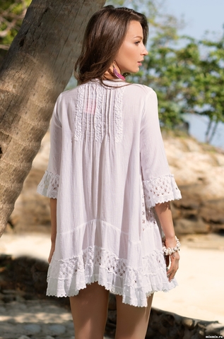 Короткая туника Mia-Amore свободного кроя с рукавами 3/4 выполнена из хлопкового кружевного полотна. По центру полочки застежка на пуговицы. Декоративные вставки по рукавам и низу изделия. Состав: 100% хлопок