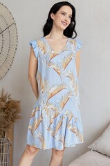 Короткая туника свободного силуэта с ассиметричной оборкой по низу и коротким рукавом в виде рюши. Изделие выполнено из тканой принтованной вискозы.