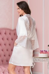 Элегантный короткий запашной халат Mia-Amore с длинными широкими рукавами, выполнен из однотонного искусственного шелка с блеском и кружевными вставками, которые расположены по низу рукавов и верху спинки. По бокам обработаны карманы. Состав: 100% полиэстер