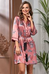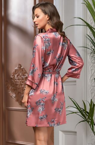 Халат с запахом и рукавами длиной 3/4 из принтованного атласного полотна темного-пудрового оттенка. Борт халата и рукава по низу украшают тонкий черный кант и однотонная отделка. Пояс халата декорирован эффектной шелковистой бахромой. В боковых швах есть карманы. Состав: 100% полиэстер