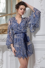 Короткий ажурный халат-кимоно Mia-Amore из кружева Шантильи на синем атласном поясе привлекает внимание эффектной конструкцией рукава, благодаря которой он выглядит еще легким и воздушным. Состав 100% полиэстер