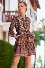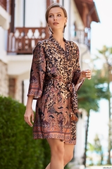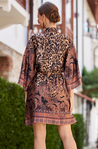 Короткий халат-кимоно Mia-Amore с рукавами ¾ из смесового шелкового полотна с анималистичным принтом. Борта халата изящно декорированы контрастным кантом. В комплекте принтованный пояс, украшенный кисточками. В боковых швах есть карманы. Состав 70% натуральный шёлк, 25% полиэстер, 5% эластан