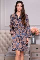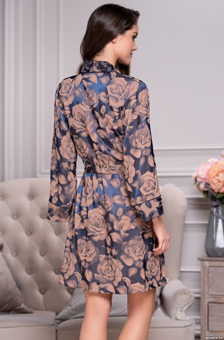 Короткий халат Mia-Amore выполнен из двухцветного жаккардового полотна. Линию борта и манжеты рукавов украшают тонкие однотонные канты. Халат на запахе с поясом, в боковых швах есть карманы. Состав: 65% полиэстер, 35% вискоза