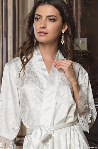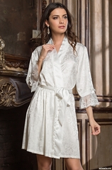 Короткий халат Mia-Amore выполнен из жаккардового искусственного шелка с рюшами из ажурного кружева по низу рукавов. Состав: полиэстер 95%, эластан 5%