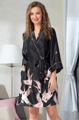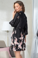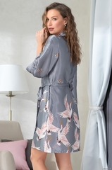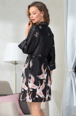 Короткий халат Mia-Amore выполнен из искусственного принтованного шелка. Манжеты выполнены из однотонного полотна. Линию борта и манжеты рукавов декорированы однотонной обтачкой с контрастным кантом. В боковых швах карманы. Состав 100% полиэстер