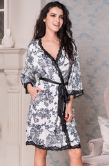 Короткий халат Mia-Mella выполнен из принтованного искусственного шелка. Борт халата, низ рукавов и изделия украшены ажурным контрастным кружевом. Халат запахивается с помощью контрастного пояса с кисточками. Состав 100% полиэстер