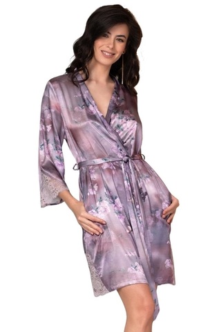 Короткий халат Mia-Amore с рукавами длиной 3/4 выполнен из смесового принтованного шелка. Рукава и халат по низу украшены вставкой из ажурного кружева. Ширина халата регулируется по талии поясом, в боковых швах карманы.