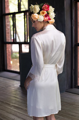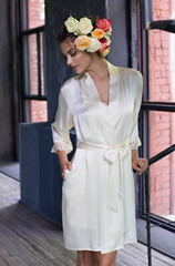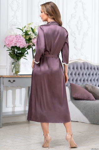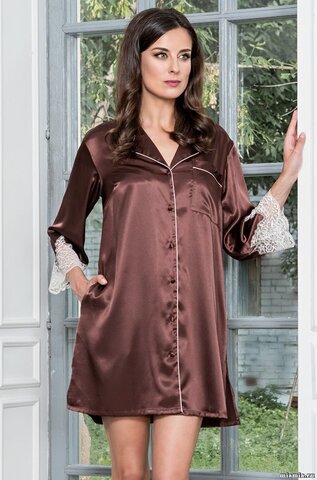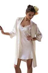 Укороченный халат от итальянского бренда Mia -Mia из 100 % натурального шелка. Модель прямого силуэта, на поясе, с втачным рукавом на манжете, выполненном из кружевного полотна. На талии халатик завязывается на внутреннюю завязку.