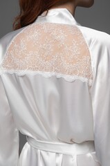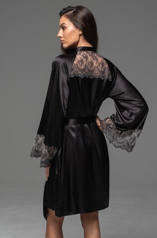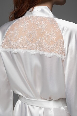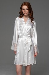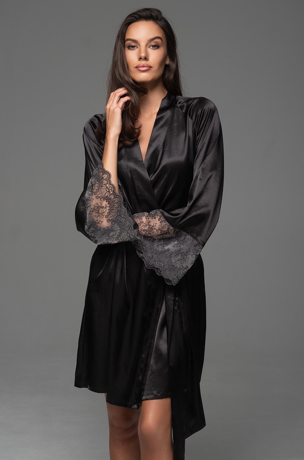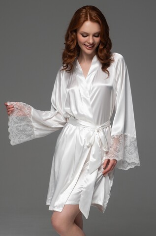 Короткий запашной халат Mia-Amore с длинными рукавами реглан выполнен из однотонного смесового шёлка. По низу рукава украшены широким вышивным кружевом. В боковых швах есть карманы. Халат запахивается с помощью широкого съемного пояса.