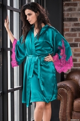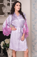 Короткий халат Mia-Amore из смесового шелкового полотна с рукавами, слегка расклешёнными к низу. Низ рукавов декорирован роскошным контрастным кружевом, элементы которого вырезаны вручную. Тонкая работа с кружевом придаёт особую изысканность этой модели. Состав 70% натуральный шелк, 25% полиэстер, 5% эластан