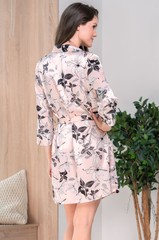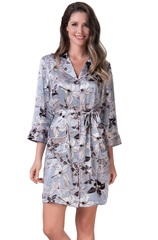 Халат Mia-Amore с центральной застежкой на пуговицы с рукавами длиной 7/8, выполнена из принтованного смесового шелка и декорирована тонким кантом по воротнику, борту и низу рукавов. В боковых швах обработаны карманы. Халат дополнен поясом. Состав: 70% натуральный шелк, 25% полиэстер, 5% эластан