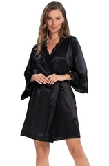 Короткий запашной халат Mia-Amore с широким длинным рукавом, выполнен из однотонного смесового шелка и декорирован кружевными вставками, по бокам расположены карманы. Состав: 70% натуральный шелк, 25% полиэстер, 5% эластан