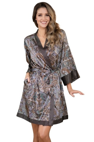 Короткий запашной халат Mia-Amore с длинным рукавом, выполнен из принтованного смесового шелка и дополнен отделкой из ткани компаньона. По бокам расположены карманы.