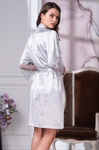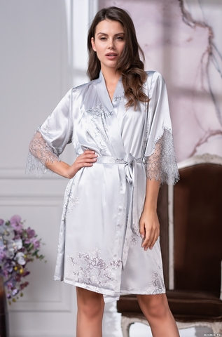 Красивый короткий шелковый халат Mia-Amore с рукавами длиной 3/4, выполнен из принтованного серебристого полотна. Низ рукавов декорирован изысканным широким вырезным кружевом. Халат запахивается на пояс, в боковых швах карманы.